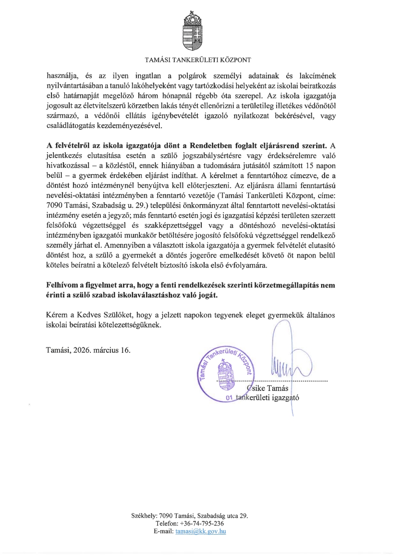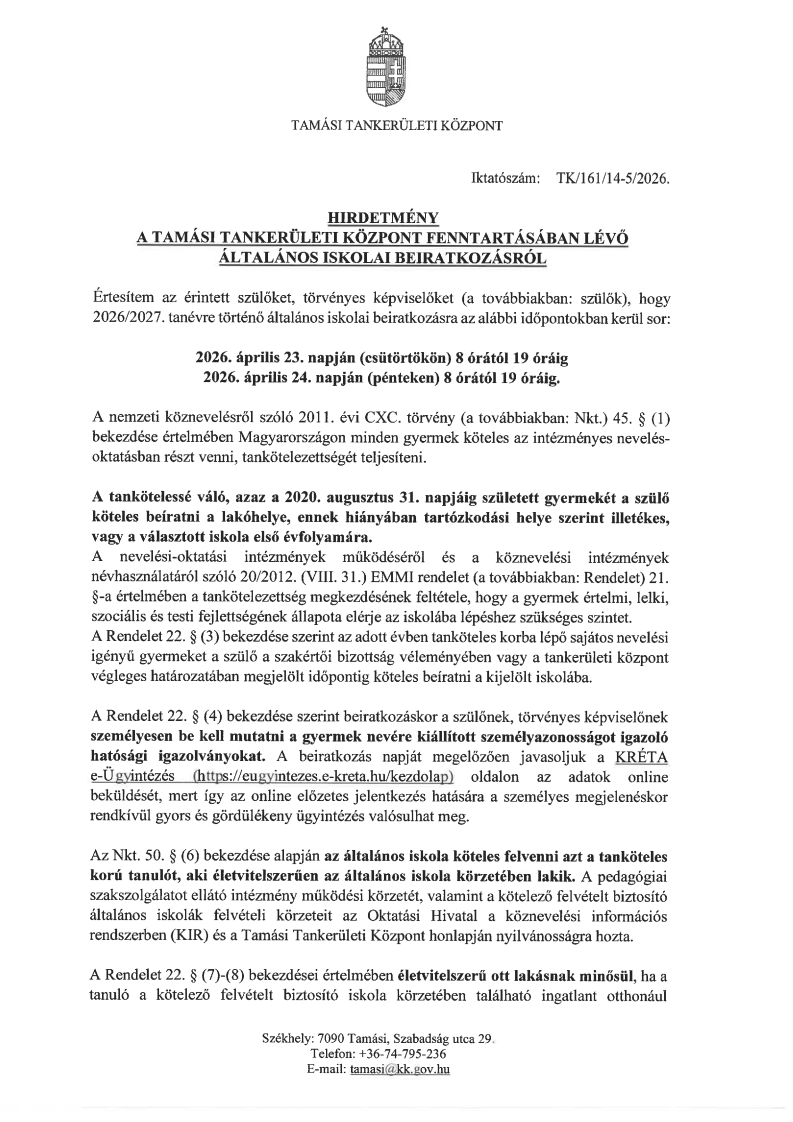 Hirdetmény általános iskolai beiratkozásról